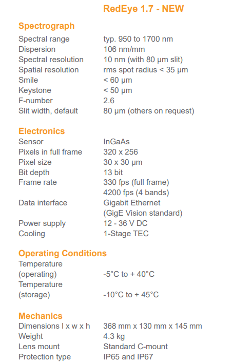 RedEye NIR-Hyperspectral camera (950 - 1700nm)