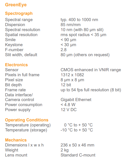 GreenEye VIS/NIR-Hyperspectral camera (400 – 1000nm)